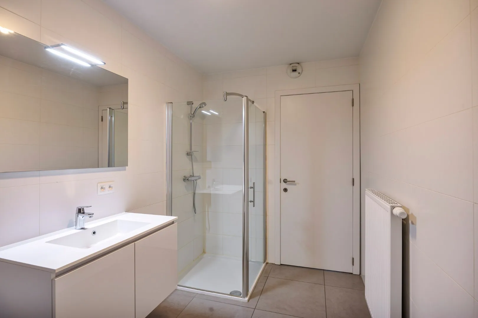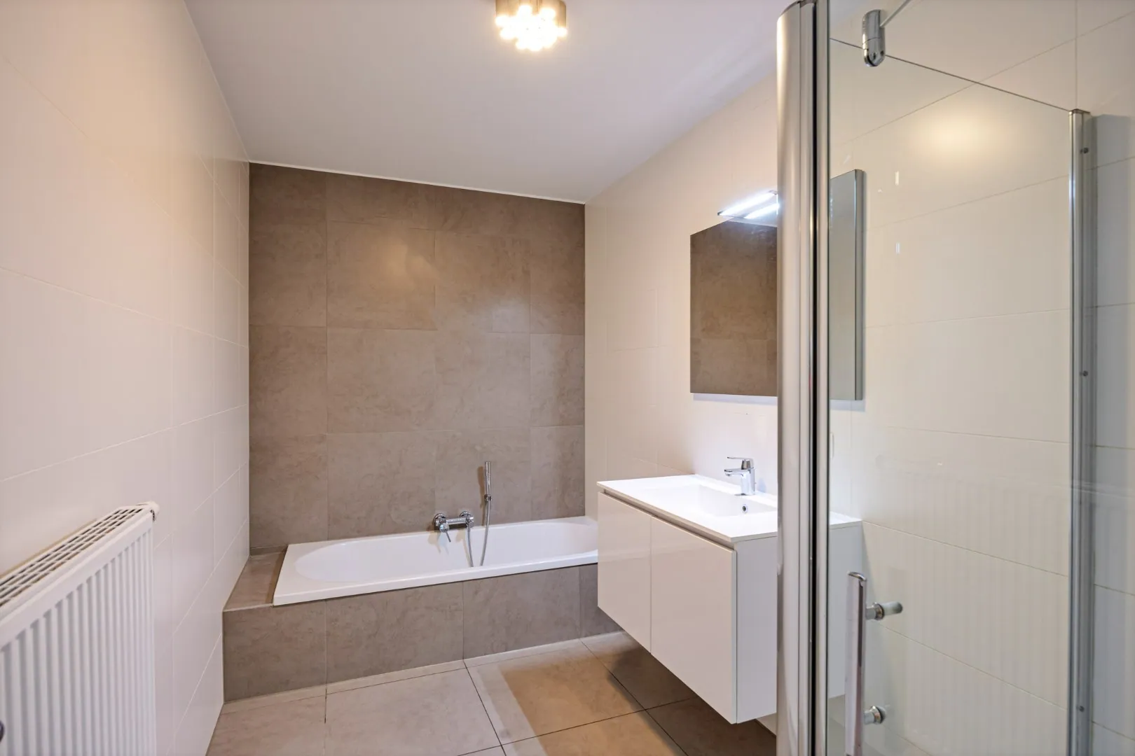 Dit appartement van 109 m² heeft een inkomhal met gastentoilet, 2 ruime slaapkamers en badkamer met lavabo en ligbad met douche.