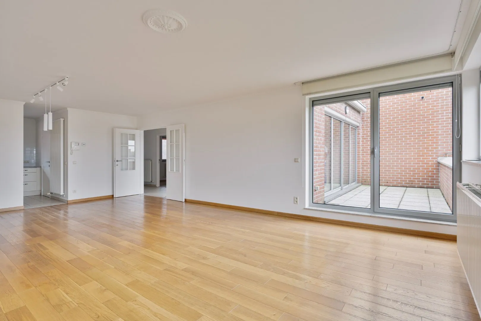 De grote en lichtrijke leefruimte staat in verbinding met het terras van 11,5m² en de ruime keuken die voorzien is van alles apparatuur. Hier is tevens nog een kleine berging voorzien met aansluiting voor een wasmachine.