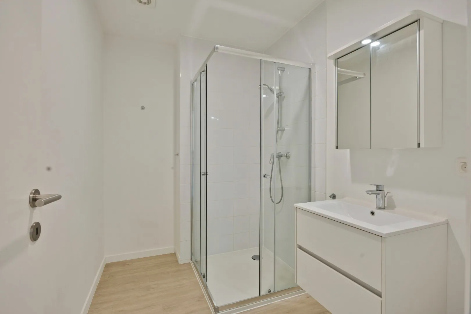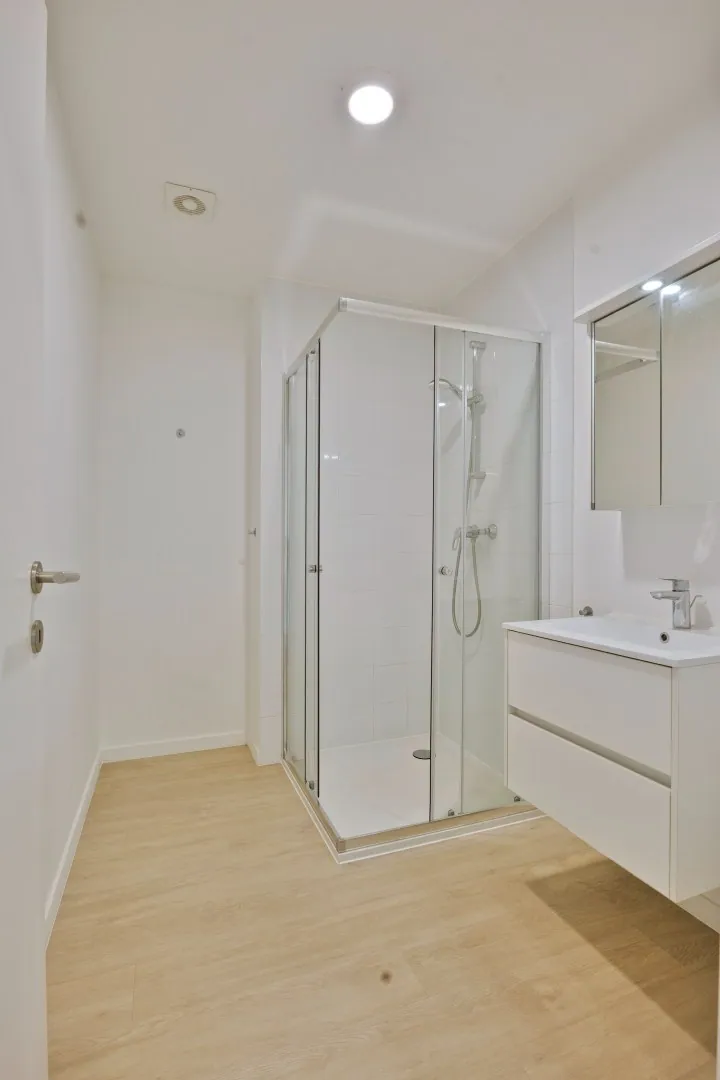 Via de hal bereiken we de badkamer en ruime slaapkamer. De badkamer beschikt over een douche en enkel lavabo.