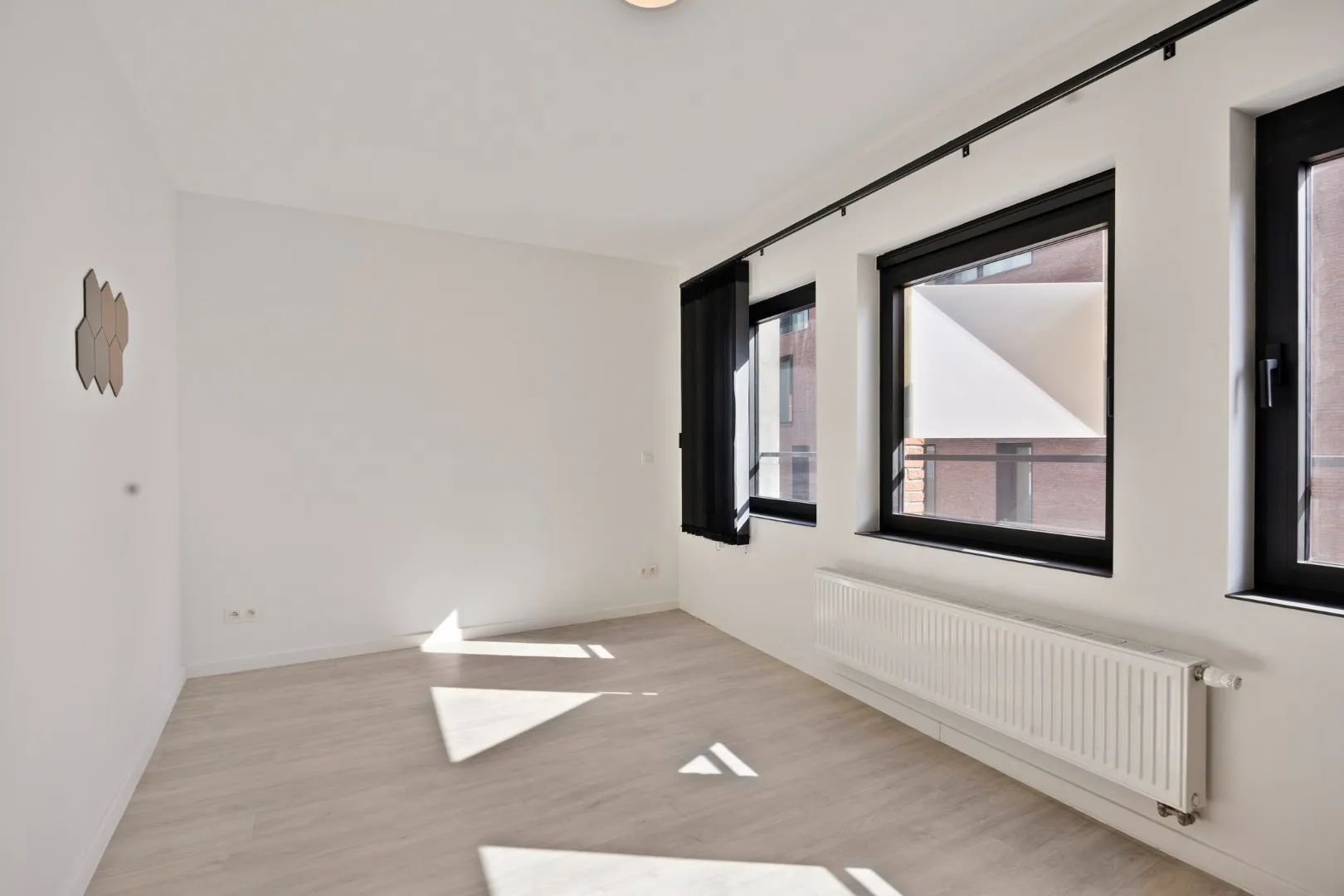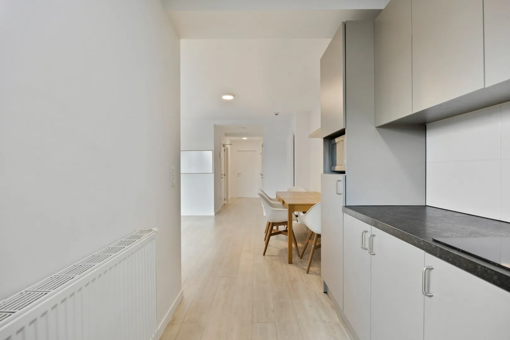 Vanuit de inkomhal hebben we toegang tot de lichtrijke leefruimte en de keuken. Deze moderne keuken is uitgerust met alle nodige toestellen en biedt veel werk- en kastruimte. De zeer ruime en lichtrijke woonkamer vormt het hart van het appartement en biedt uitzonderlijk veel ruimte voor een centrumligging. Vanuit de woonkamer bereiken we het terras van 6 m².