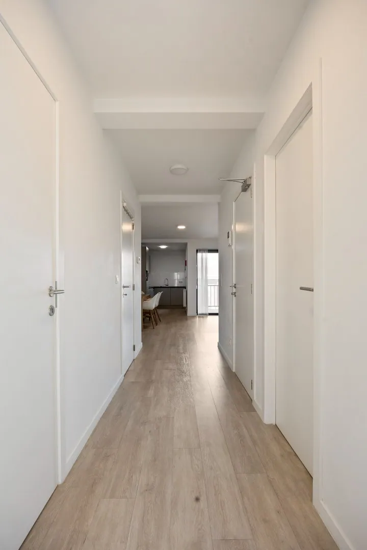 We betreden het appartement via een inkomhal waar voldoende plaats is voor een vestiaire. Daarnaast is er een apart gastentoilet.