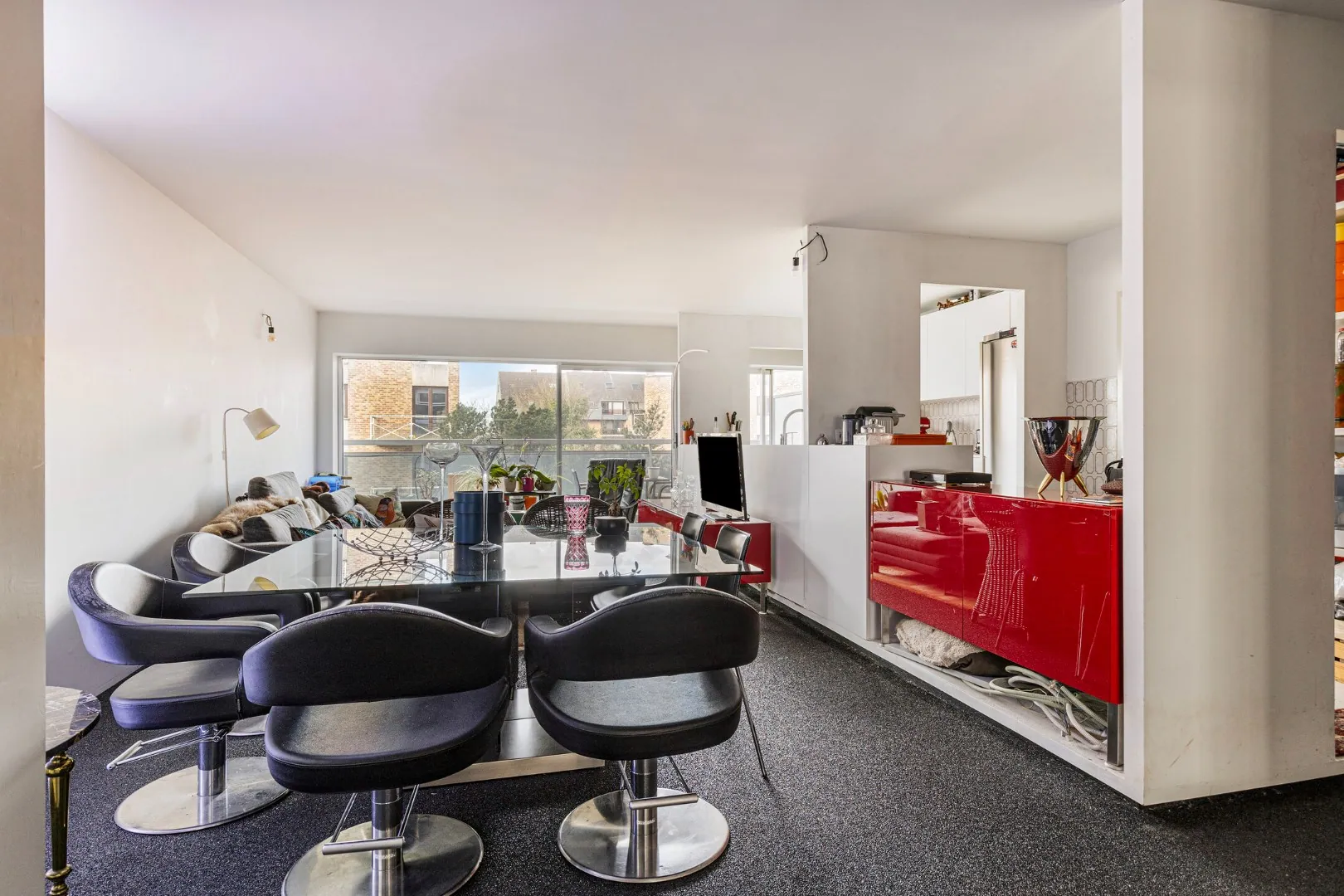 Bij het betreden van het appartement kom je centraal binnen. Aan de rechterzijde bevinden zich de eetkamer, de woonkamer en de open keuken, die volledig is uitgerust met alle nodige toestellen. In de keuken is er tevens een aansluiting voorzien voor een wasmachine. Vanuit de leefruimte heb je toegang tot een ruim en aangenaam terras.