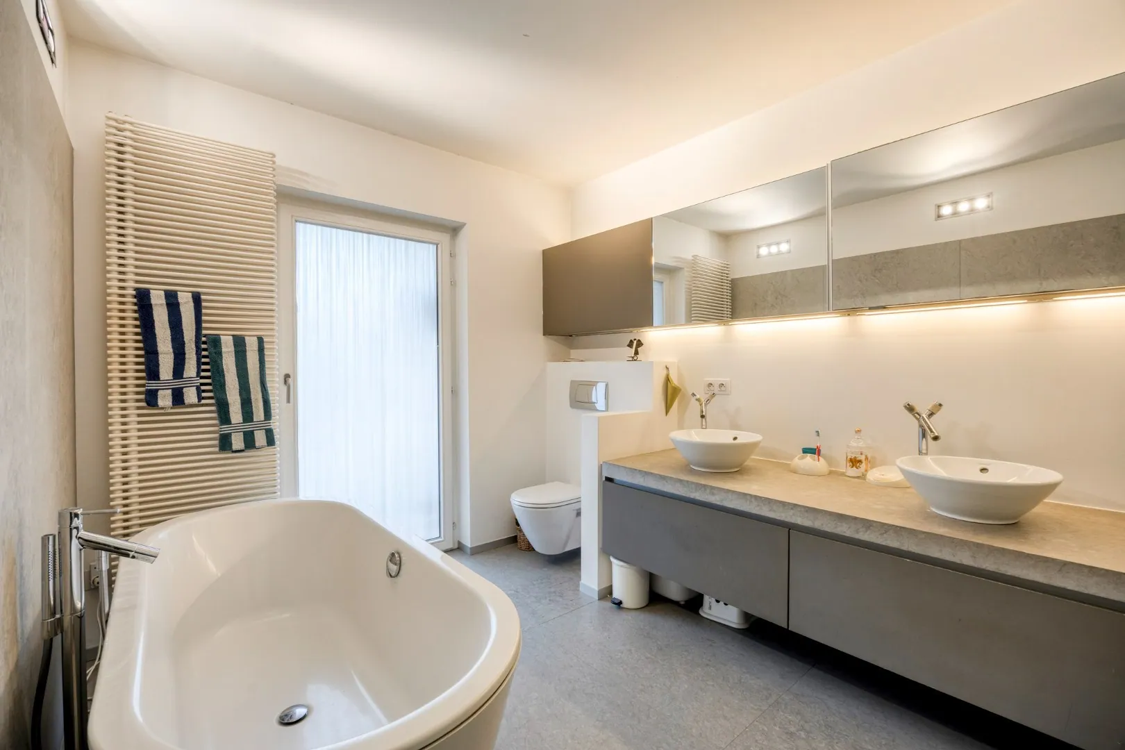 We komen binnen in de inkomhal voorzien van een vestiairekast. Verder is er een gastentoilet met lavabo. Via de inkomhal kom je in de eerste slaapkamer en 2de ruime slaapkamer die momenteel gebruikt wordt als bureauruimte. Verder vinden we de lichtrijke leefruimte met aansluitend de volledig geïnstalleerde keuken en eetkamer die toegang geeft tot het ruime terras van maar liefst 50m². Aan de achterzijde ligt de 3de ruime slaapkamer (met toegang tot terras) en ruime badkamer met bad, douche, toilet en dubbel lavabomeubel. Naast de badkamer ligt een praktische berging met aansluiting voor wasmachine en droogkast.