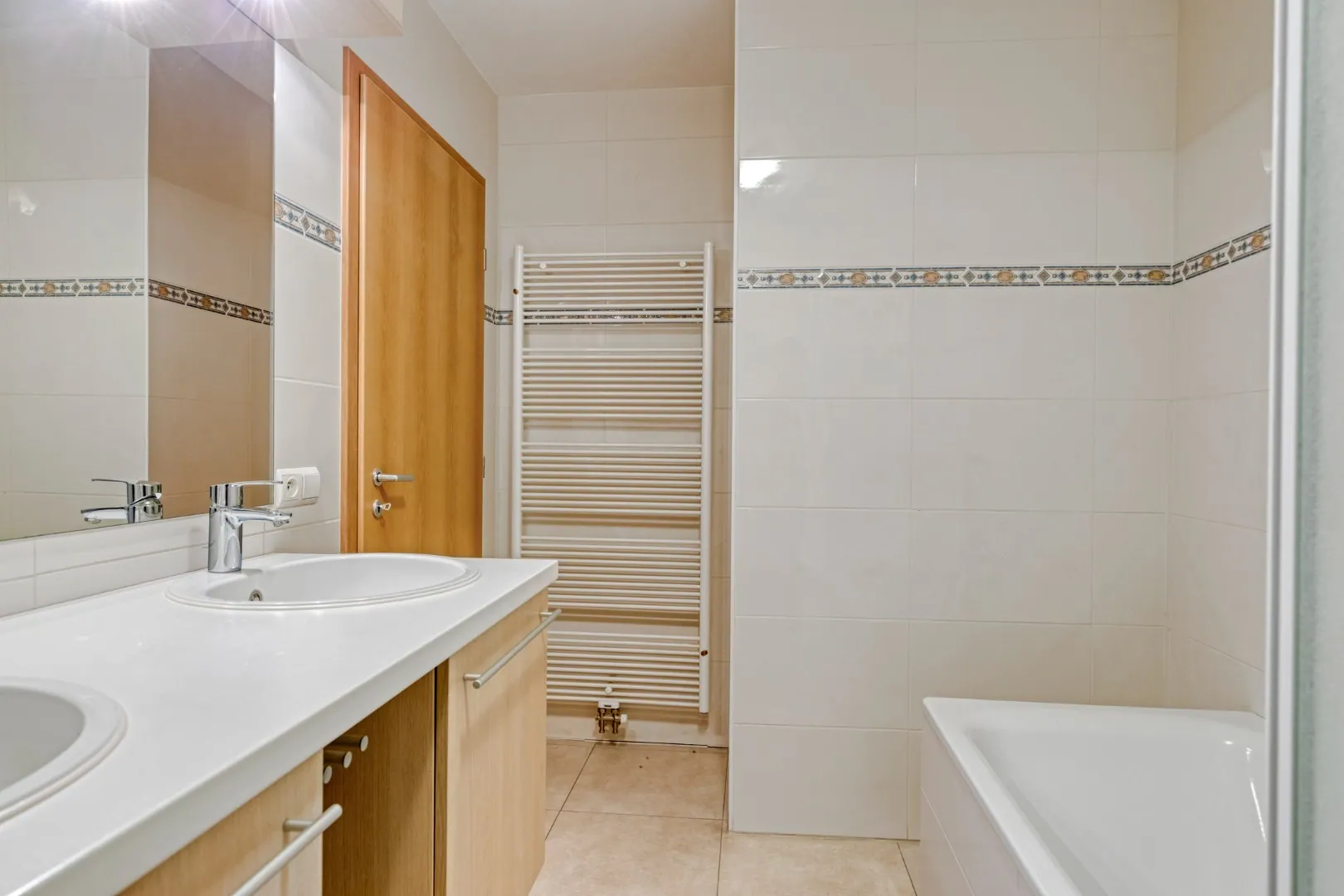 Het instapklare appartement bestaat uit een inkomhal met vestiaire en apart gastentoilet, een leefruimte met open en geïnstalleerde keuken. De keuken en de leefruimte geven toegang tot het zeer ruime en west georiënteerde terras van 8m² Verder hebben we 2 ruime slaapkamers van 11,5m² en 11m², een badkamer met dubbel lavabo en ligbad, een berging met aansluiting voor een wasmachine en droogkast.