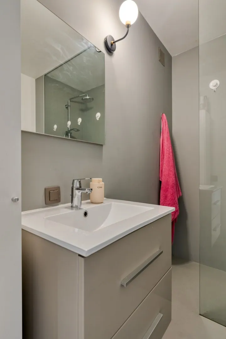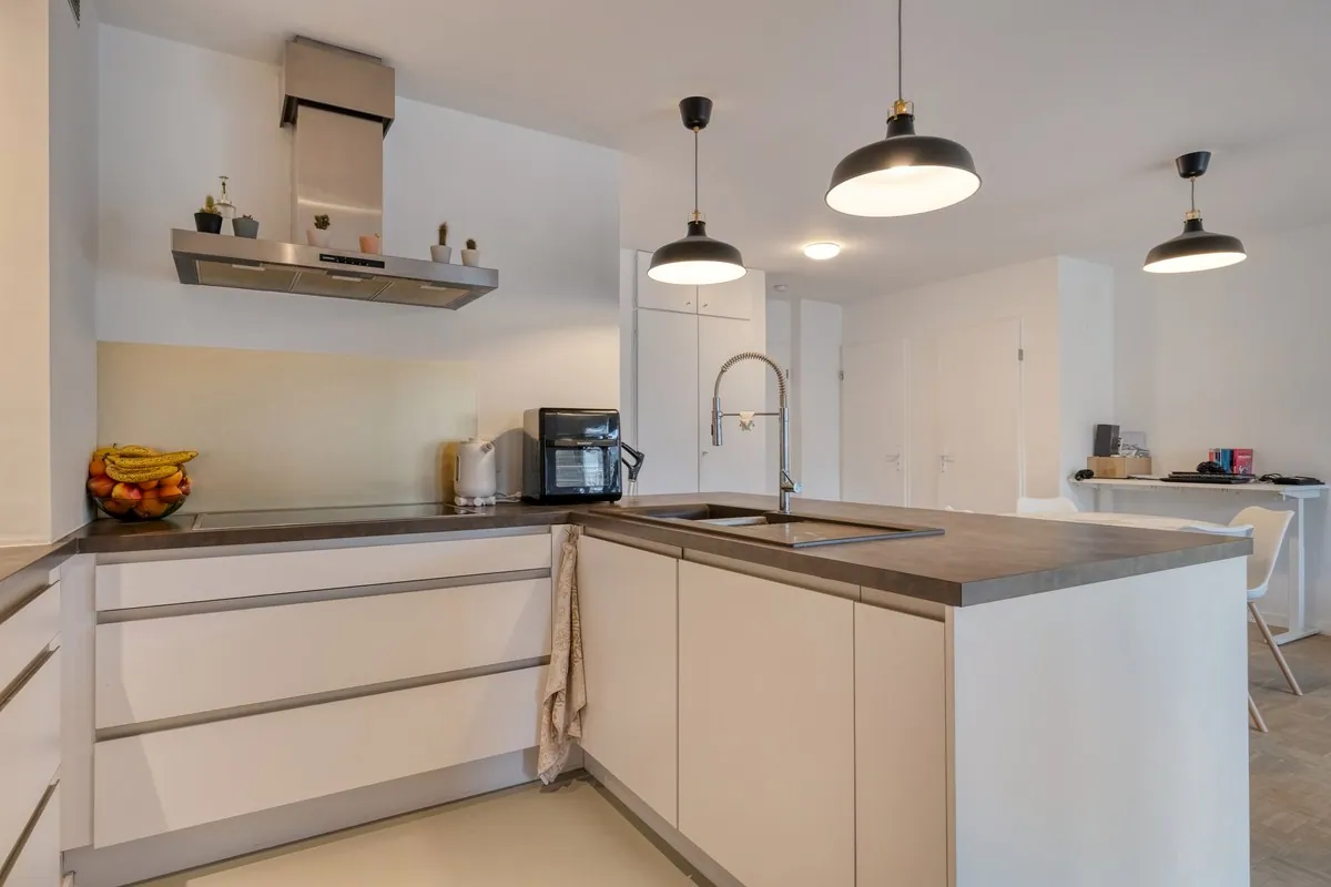 Het instapklare en energiezuinige appartement bestaat uit een inkomhal met vestiairekast, een leefruimte met open en volledig geïnstalleerde keuken. De keuken en de leefruimte geven toegang tot het terras. Verder hebben we een ruime slaapkamer 13,5 m², een badkamer met enkel lavabo, douche, toilet en aansluiting voor wasmachine en droogkast.
