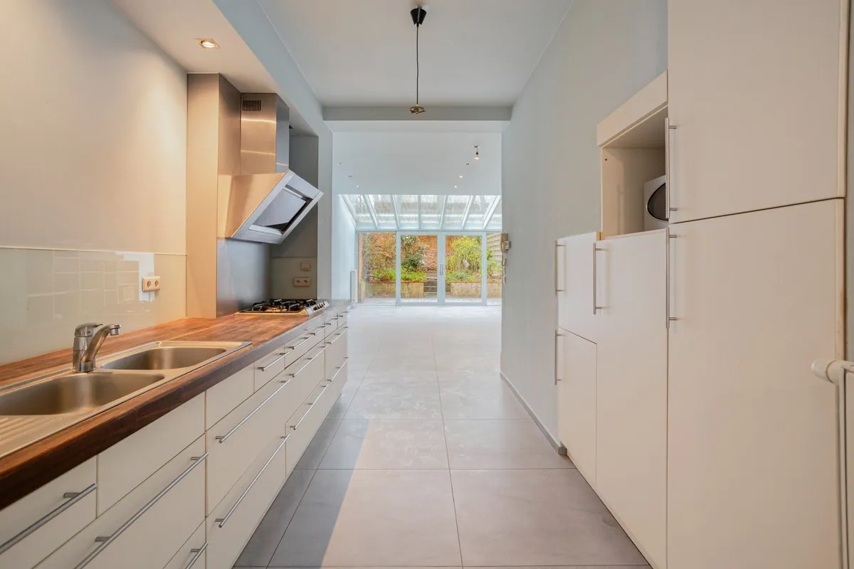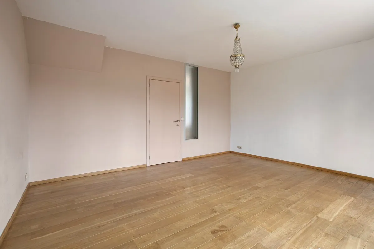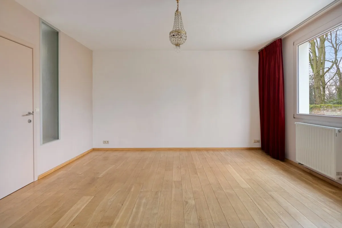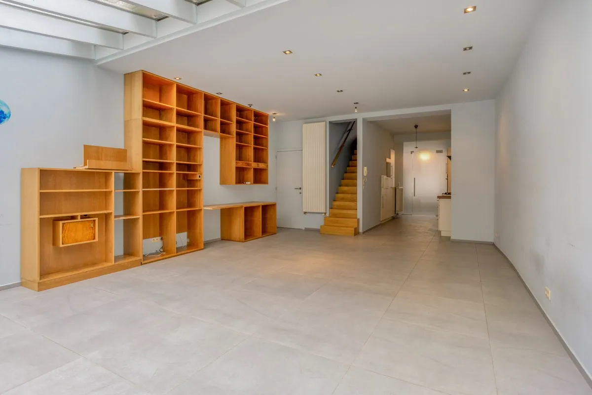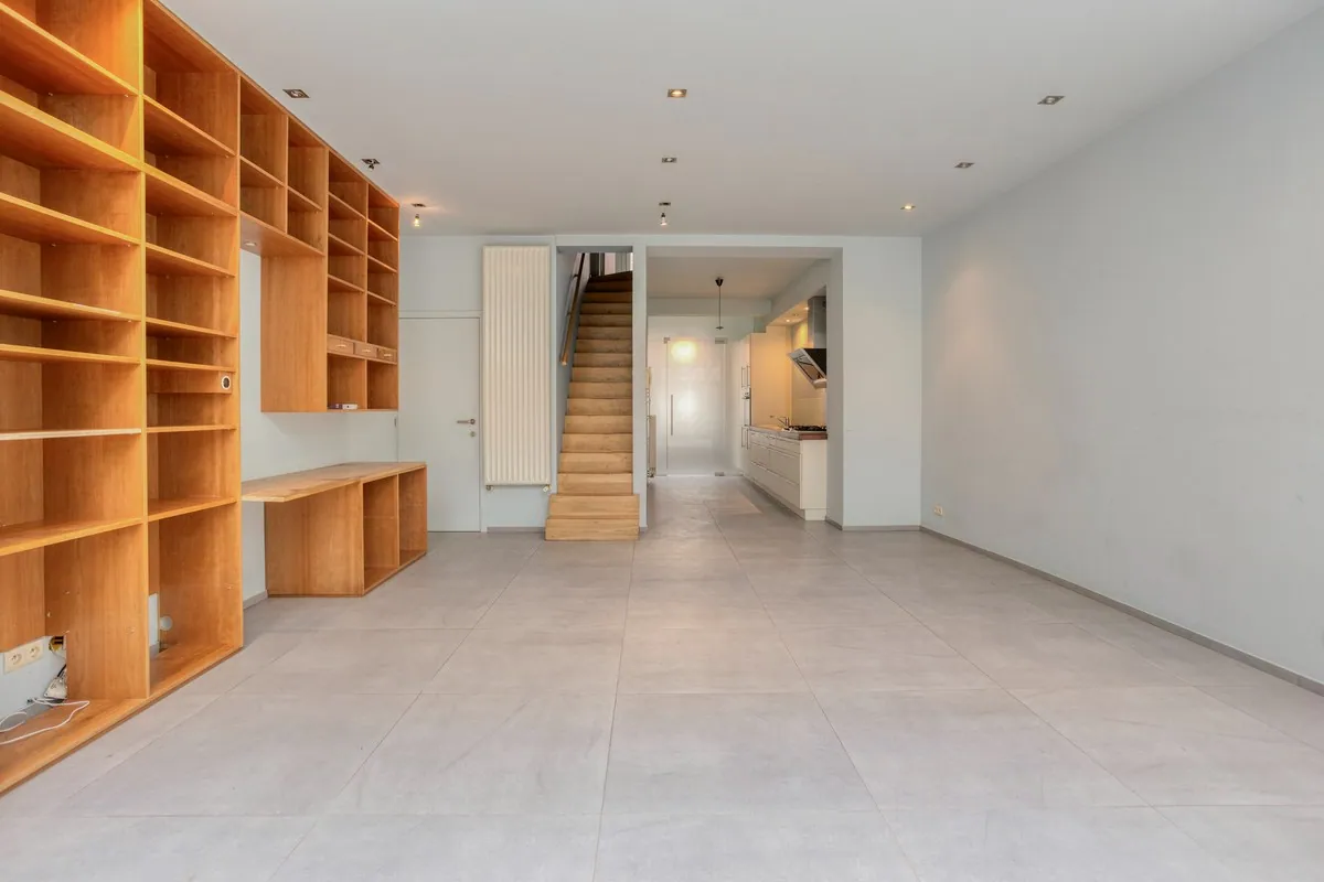 Dit pand bestaat uit een ruim duplex appartement met op de gelijkvloers een aangename inkomhal met gastentoilet, ruime en volledig uitgeruste keuken. De keuken staat in verbinding met de lichtrijke leefruimte die toegang heet tot het ruime terras en tuin. Op de verdieping vinden we 2 slaapkamers (9 en 22,5 m²) en een badkamer met toilet, dubbele lavabo en ligbad. Op deze verdieping vinden we ook nog de keuken voor de studentenkamers, deze is te bereiken via een aparte trap vanuit de inkomhal.