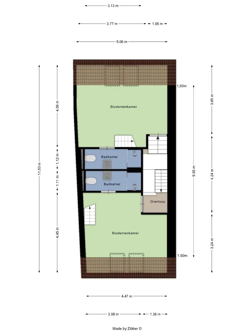 De 2 studentenkamers bevinden zich op de 2de en 3de verdieping. Beide studentenkamer bestaan uit een kamer met ruime mezzanine alsook elk een eigen uitgeruste badkamer met toilet, douche en lavabo.