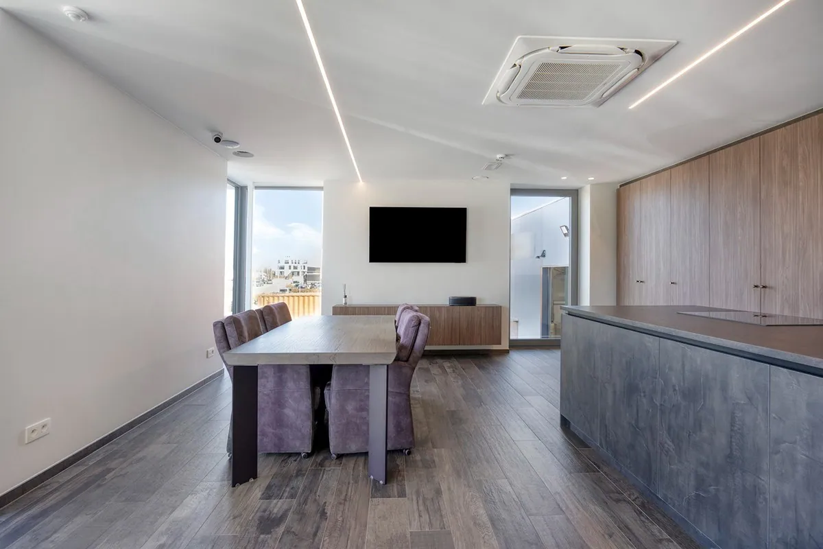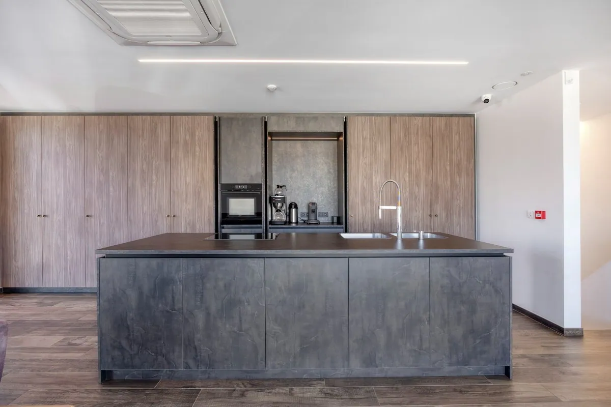In het voorstel gedeelte vinden we de kantoren, dit bestaat uit 3 kantoor ruimtes, 2 aparte toiletten, een douche en ruime vergaderzaal met volledig uitgeruste keuken.