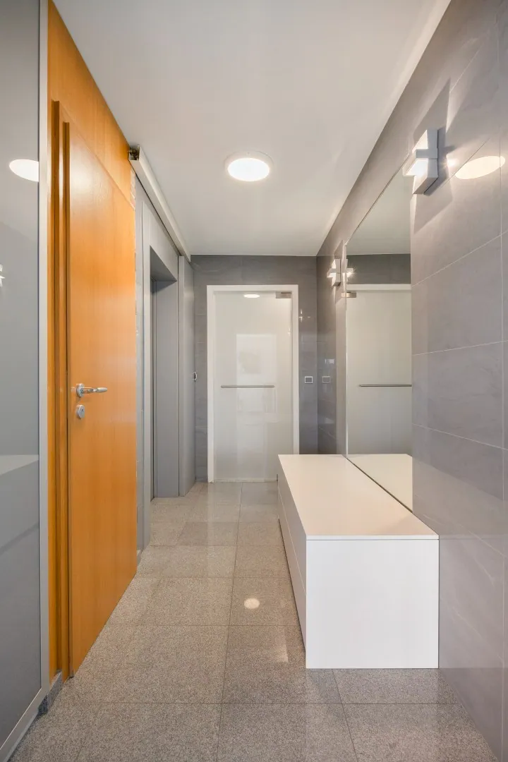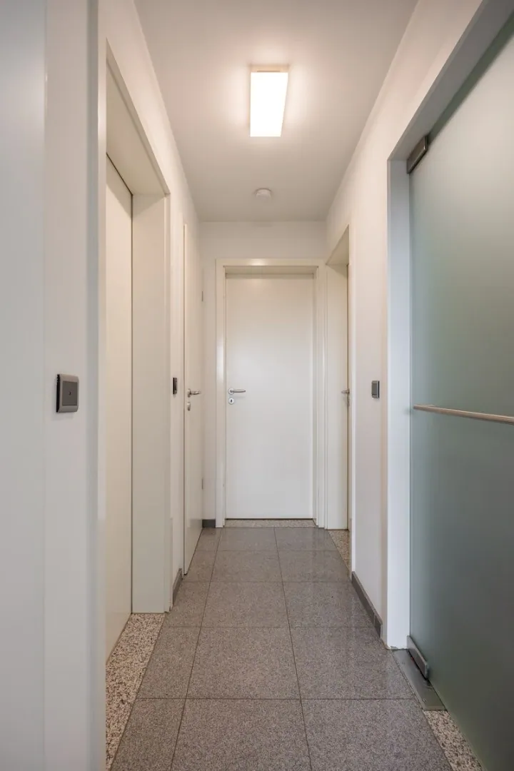 We komen binnen in de inkomhal met private toegang, de lift komt rechtstreeks uit in dit appartement. De inkomhal heeft ruimte voor een vestaire en een apart gastentoilet. Verder vinden we de fantastische leefruimte met uitzicht over het ruime terras van 60m² dat het volledige appartement omringt. Aansluitend vinden we de volledig geïnstalleerde keuken. Het terras heet een zuid-zuidwest oriëntatie.