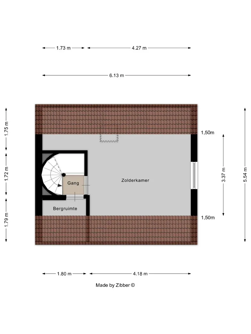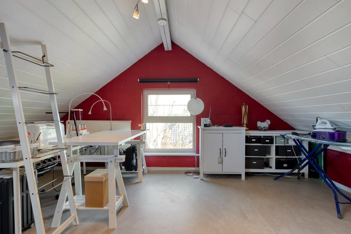 We bereiken de tweede verdieping via een vaste trap naar de zolder. Deze is al volledig afgewerkt en kan gebruikt worden als 4de slaapkamer, bureau of opslagplaats. Deze strekt zich uit tot de volledige oppervlakte van de zolderverdieping, namelijk 34m².