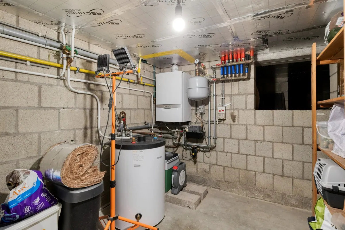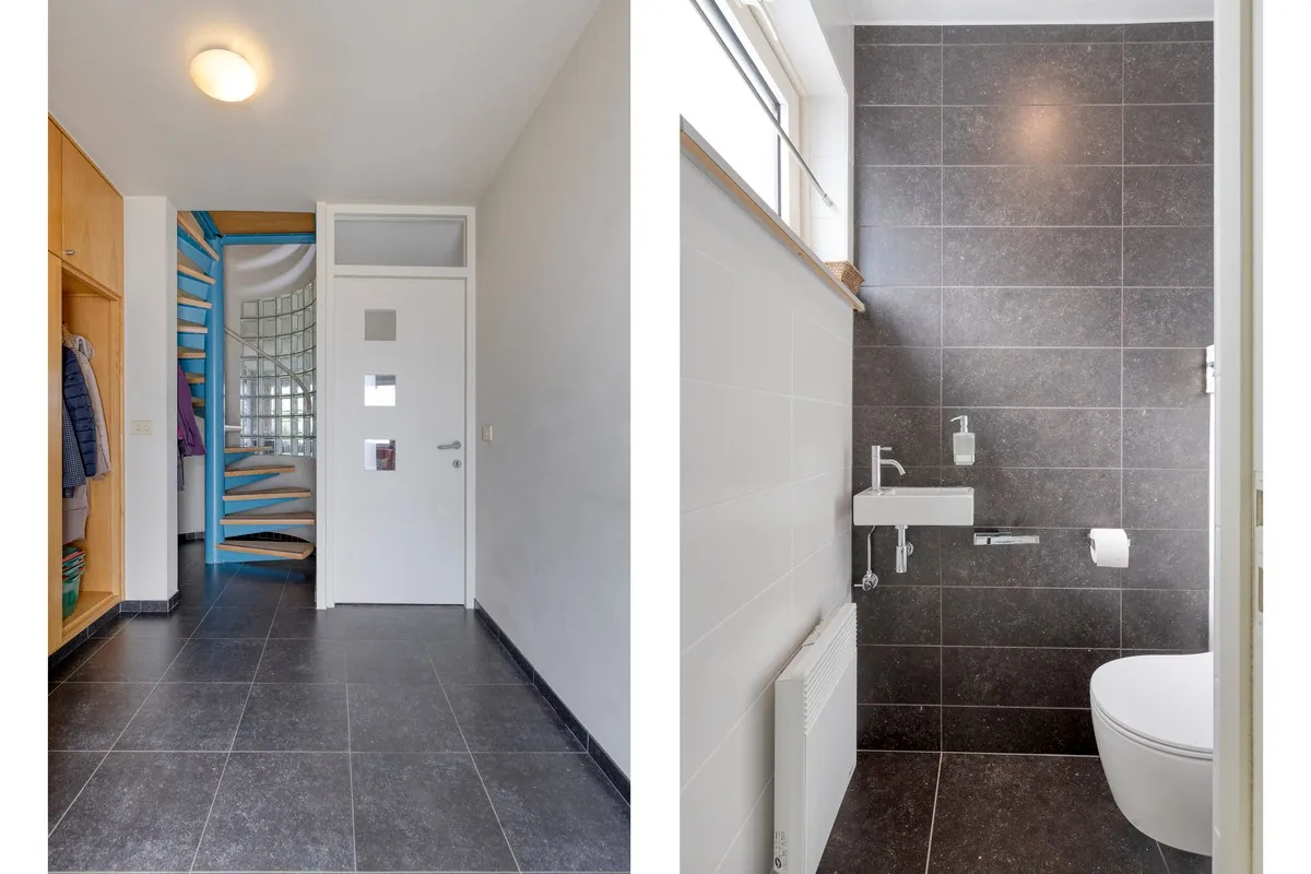 We komen binnen in de inkomhal, met vestiairekast en apart toilet. Via de inkomhal betreden we de lichtrijke leefruimte met zicht op de tuin en omliggende velden. Aansluitend vinden we een eetplaats met een volledig geïnstalleerde keuken. Naast de keuken vinden we nog een praktische berging met aansluiting voor wasmachine en droogkast.
