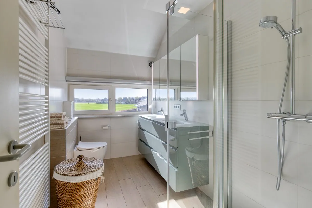 Op de eerste verdieping vinden we de ruime nachthal met 3 slaapkamers van 14m², 10m² en 10m² en een badkamer met douche, dubbel lavabomeubel en toilet.