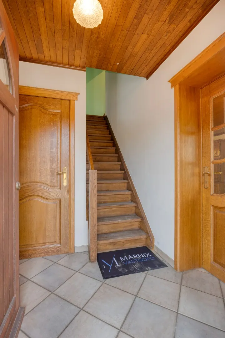 We betreden de woning via de inkomhal, deze beschikt over een apart toilet. Verder vinden we de lichtrijke leefruimte met authentieke elementen zoals de open haard. Aansluitend aan de leefruimte vinden de geïnstalleerde keuken, nabij de keuken vinden we een praktische berging met aansluiting voor wasmachine en droogkast.