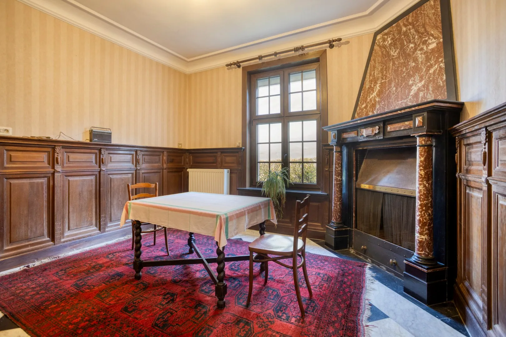 We komen binnen in de ruime inkomhal vol authentieke charme. Via de inkomhal betreden we de lichtrijke leefruimte met authentieke elementen, aansluitend vinden we een eetplaats en keuken. Naast de keuken vinden we de veranda. Op deze verdieping vinden we nog een apart toilet.