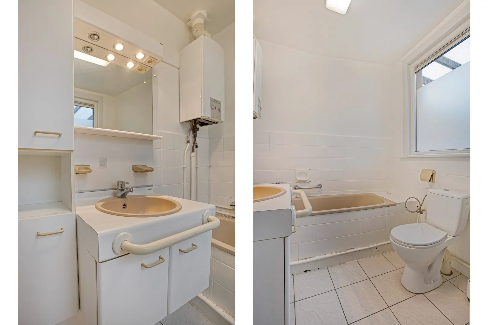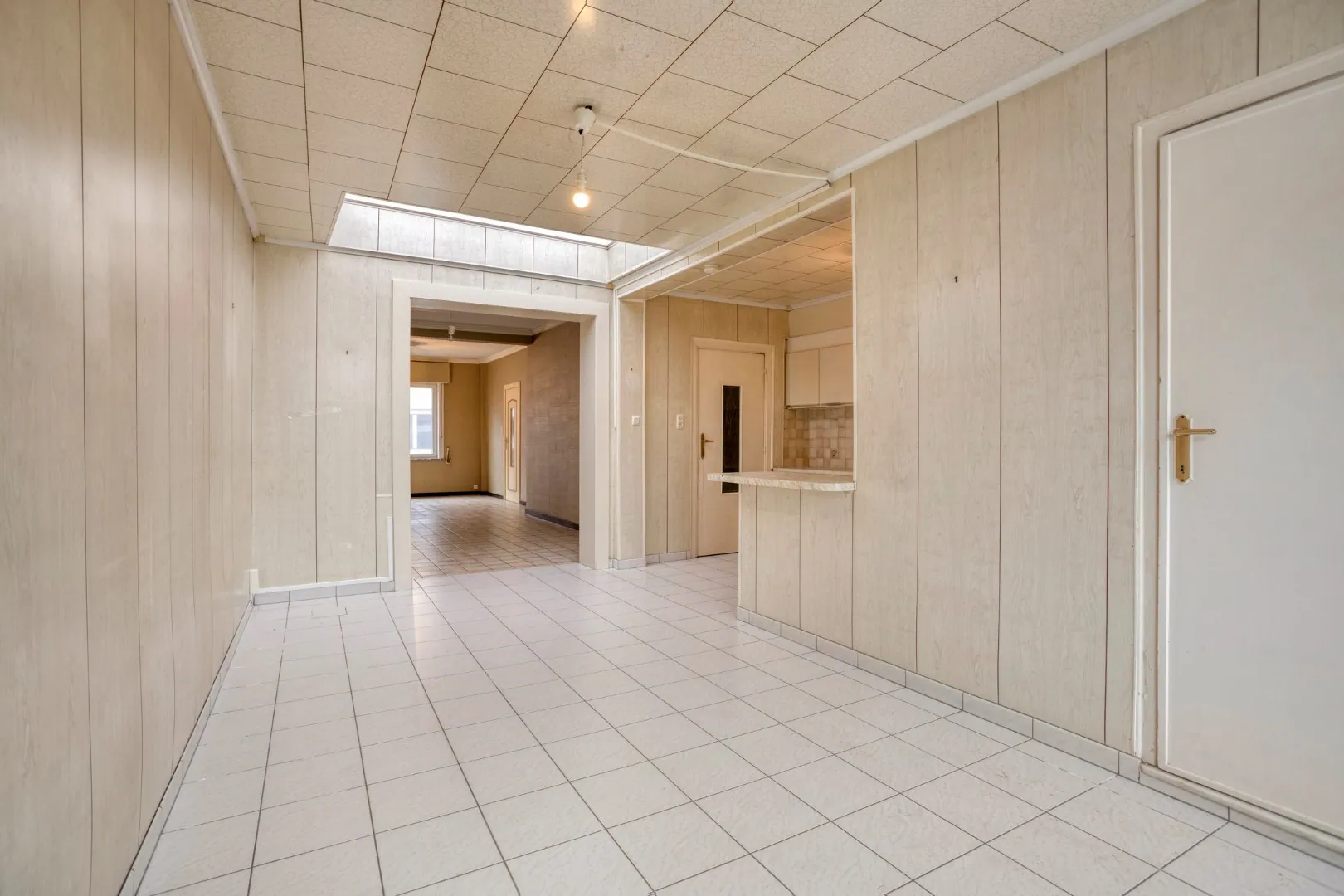 We betreden de woning via de inkomhal. Rechts van de inkomhal bevindt zich de woonkamer en eetkamer, aansluitend vinden we de ruime keuken. Tot slot vinden we op deze verdieping de badkamer met bad, toilet en enkel lavabo.