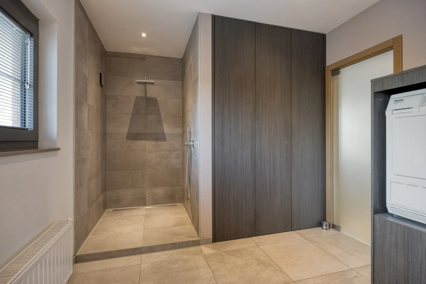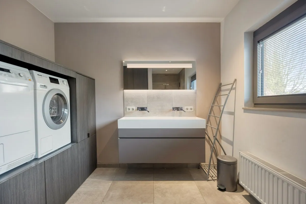 Via de trap bereiken we de eerste verdieping met nachthal en apart toilet, 3 ruime slaapkamers van 26m², 19m² en 15m², badkamer met inloopdouche, inbouwkast, dubbel lavabo en aansluiting voor wasmachine en droogkast. Verder is er nog een praktische berging.