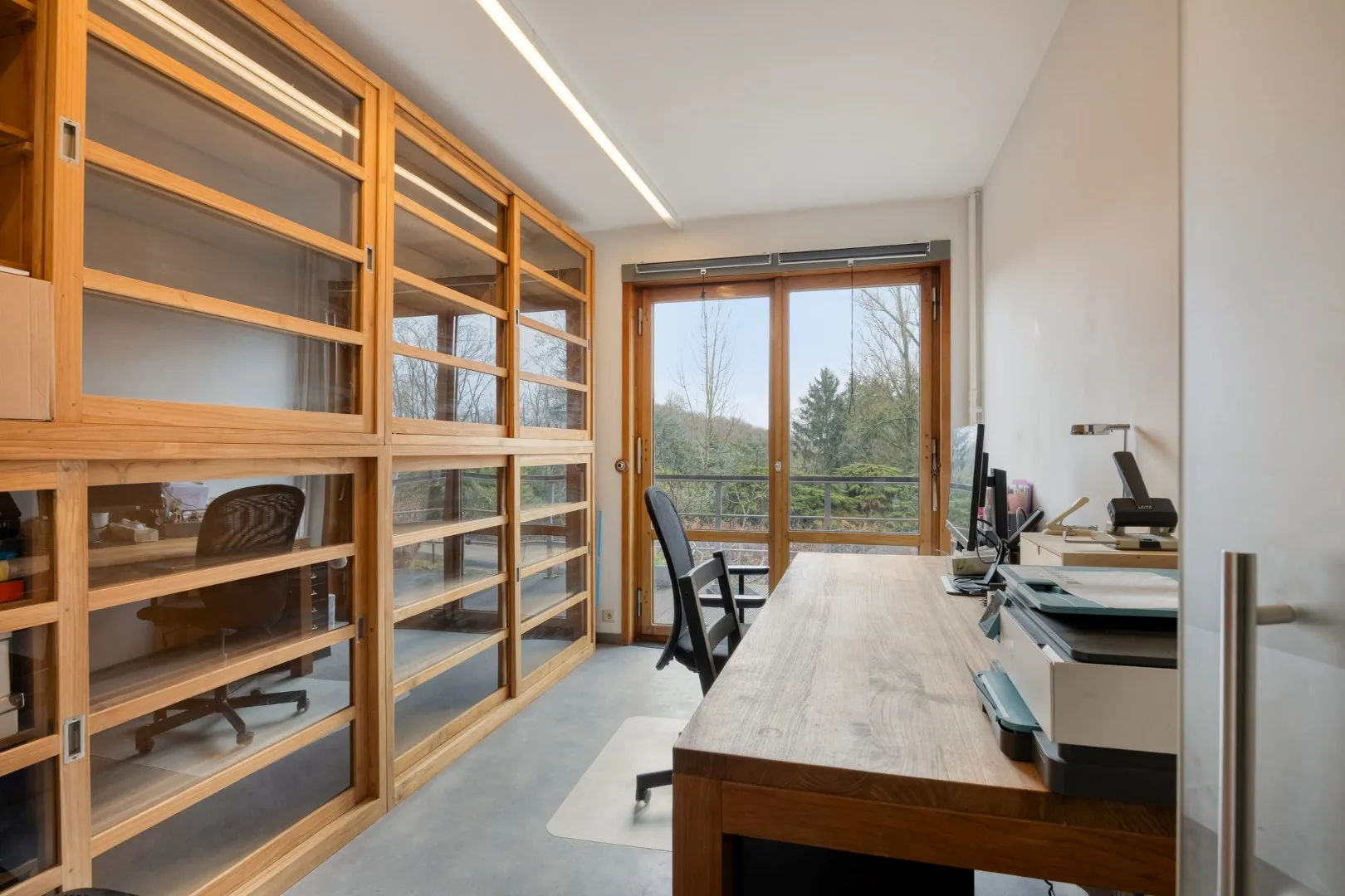 We betreden de woning via de ruime inkomhal met ruimte voor een vestiairekast en apart gastentoilet. Vanuit de inkomhal bereiken we de lichtrijke leefruimte. Aansluitend aan de leefruimte bevinden zich de eetplaats en de open en volledig geïnstalleerde keuken. Op het gelijkvloers vinden we verder nog een bureaureaumte. Deze kan eventueel gebruikt worden als extra slaapkamer.
