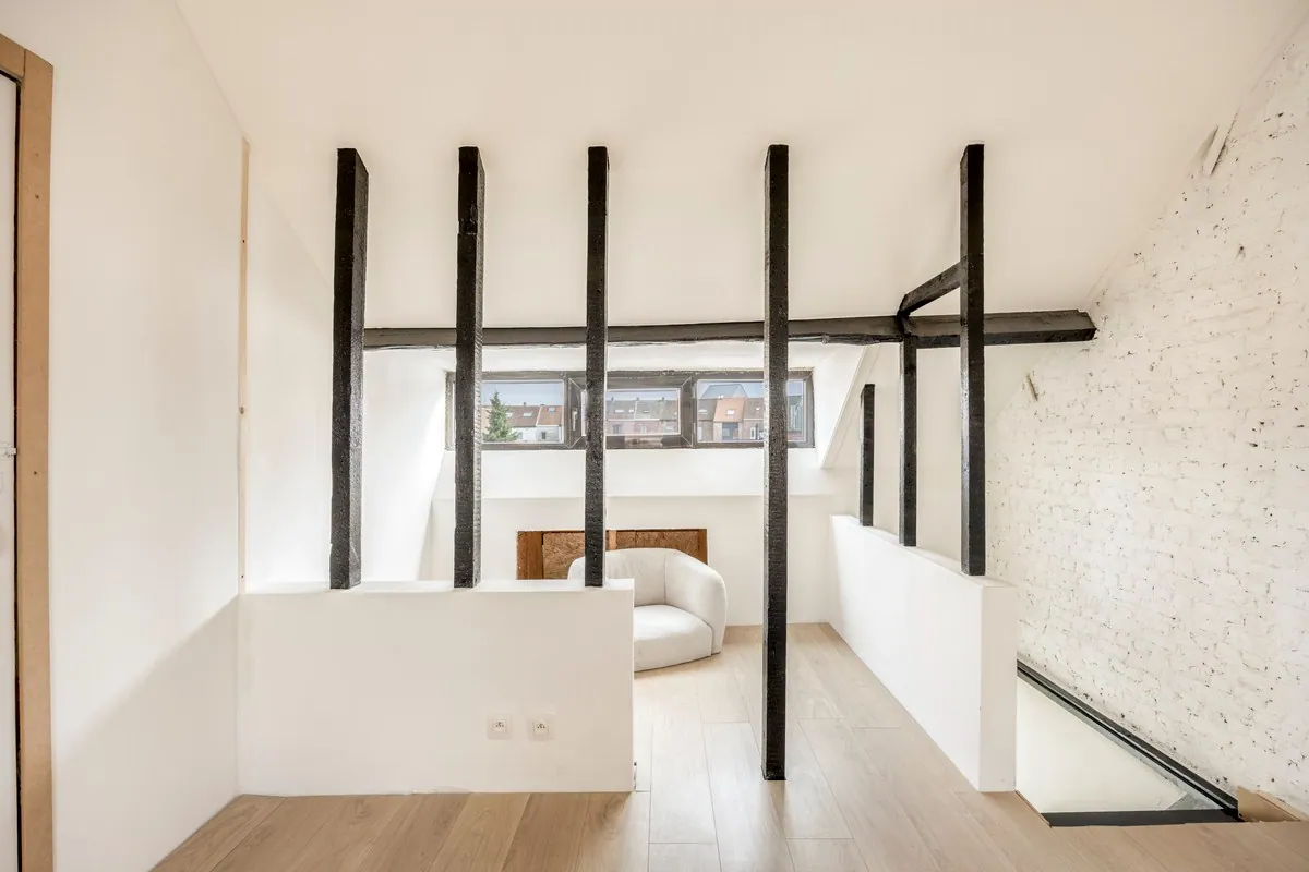 Via de trap bereiken we de eerste verdieping. Hier bevinden zich 2 slaapkamers van 15m² en 38,5 m², elk met eigen douche en lavabo. De grote slaapkamer is een duplex met op de 2de verdieping een ruimte van 24m². Deze ruimte kan ook dienen als 3de slaapkamer mits het plaatsen van een gyproc muur.