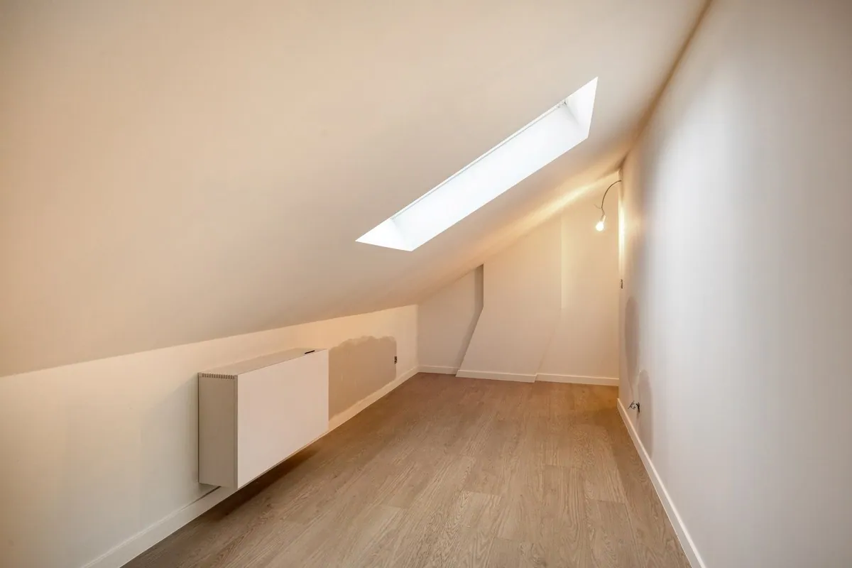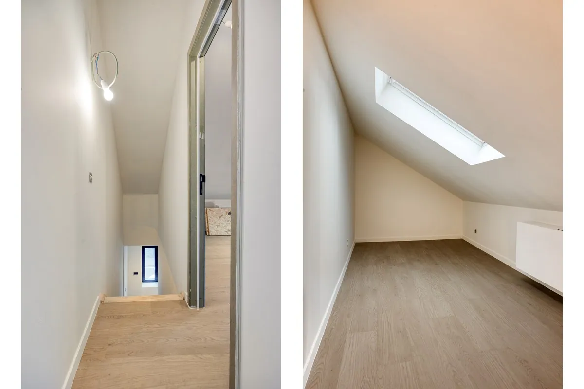 Op de 2de verdieping (zolder met vaste trap) vinden we nog 2 slaapkamers. De iets kleinere slaapkamer kan eventueel gebruikt worden als dressing. Verder beschikt deze verdieping over een douchekamer, deze dient nog verder afgewerkt te worden.