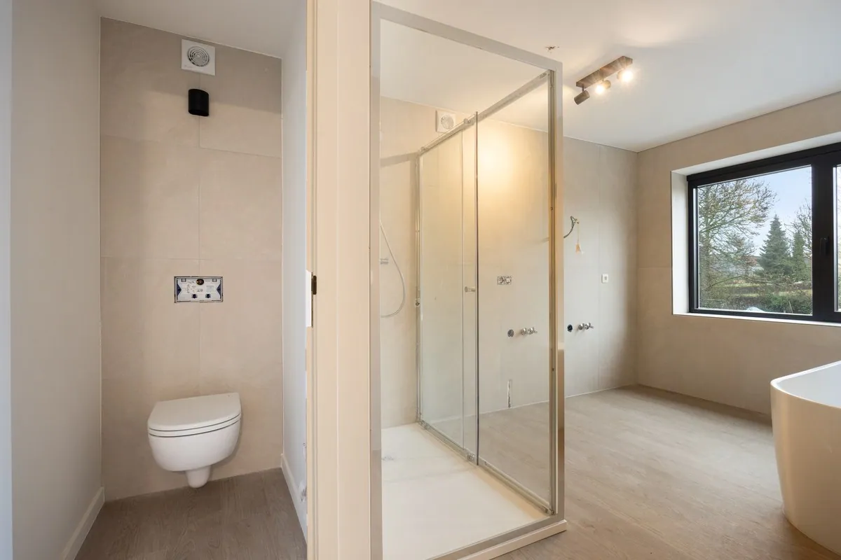 Op de eerste verdieping vinden we 2 zeer ruime slaapkamers en een badkamer met douche, ligbad en een 2de toilet. De lavabo(s) worden nog geplaatst door de verkoper.